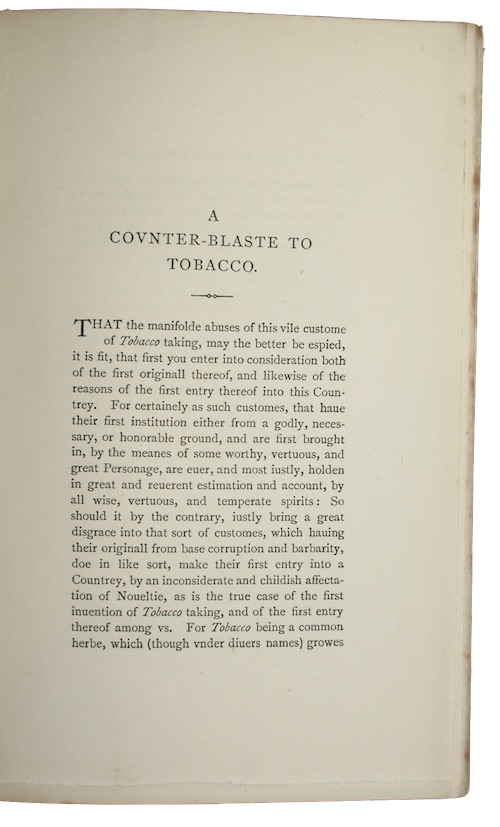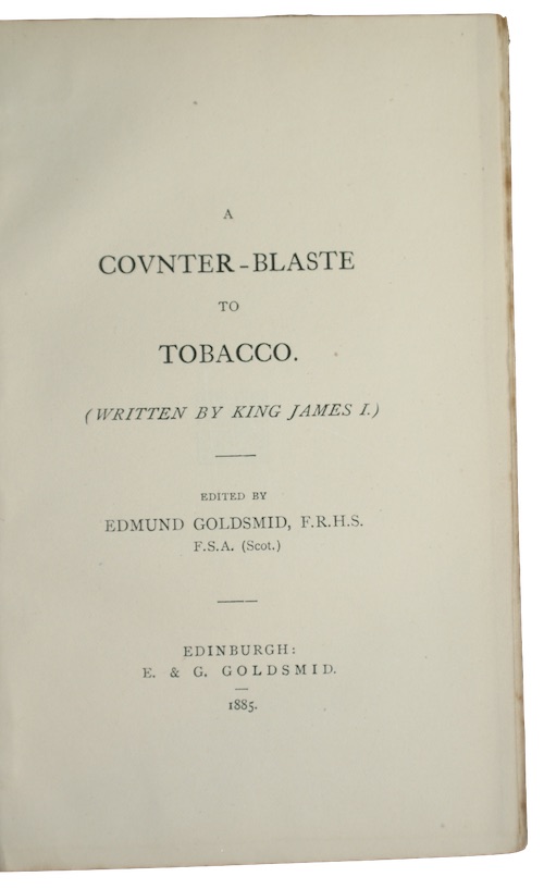 A Victorian printing of this polemic composed by James I in 1604 expressing his distaste for the habit of tobacco smoking, decrying the hateful odour and warning of the danger to ones lungs.