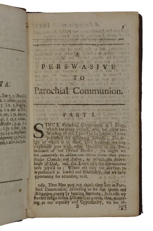 A revised edition of two discourses by Church of England clergyman Charles Palmer (1685-1735); the first concerning parochial communion; the second concerning imprecations in common discourse and in prayer. The essays were first published in quarto format in 1702.
