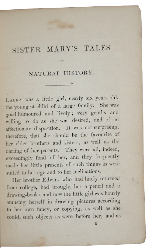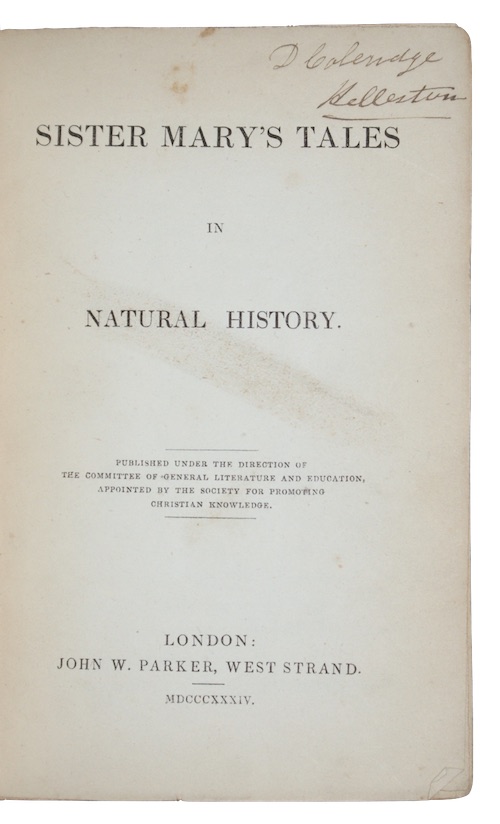 The first edition, 'Published under the direction of the Committee of General Literature and Education, appointed by the Society for Promoting Christian Knowledge', a collection of 13 short stories on natural history for children intended to direct 'the infant mind to seek for those proofs of Divine wisdom, power, and goodness in the formation and habits of these various beings, which, at a mature age, will assuredly reward the study of the naturalist'.