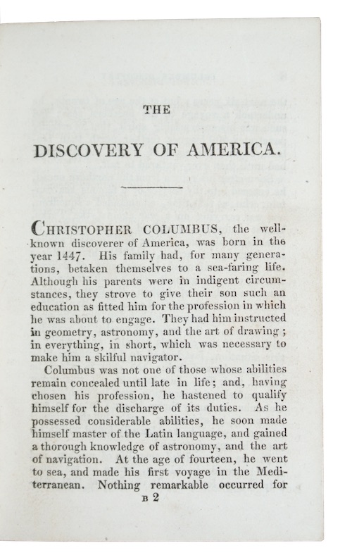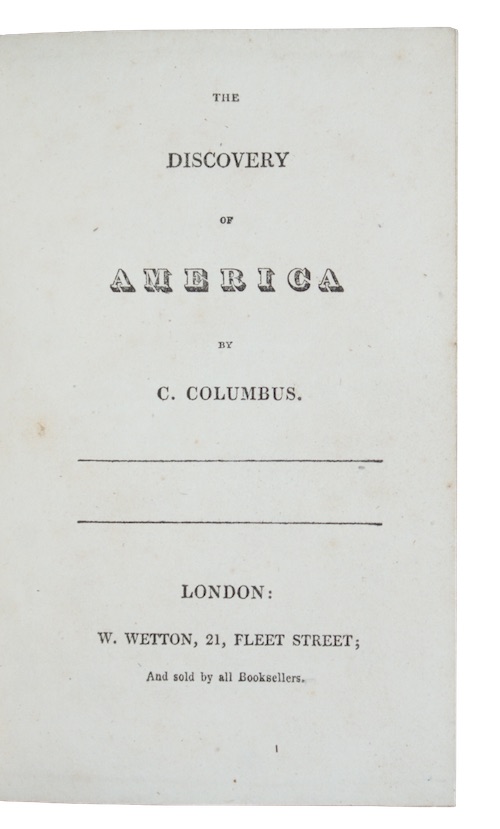 An anonymous history of the voyage of Christopher Columbus to America, designed for a juvenile readership to teach the importance of 'sobriety, temperance, and regularity of conduct'. This copy was bound for the Society for Promoting Christian Knowledge, who presumably approved of the narrative not merely for it's morality but also the references made to introduction of Christianity to the Native Americans (albeit as a part of a deception during a lunar eclipse). A 'New Edition', printed following the death of W. Wetton, appeared in 1836.