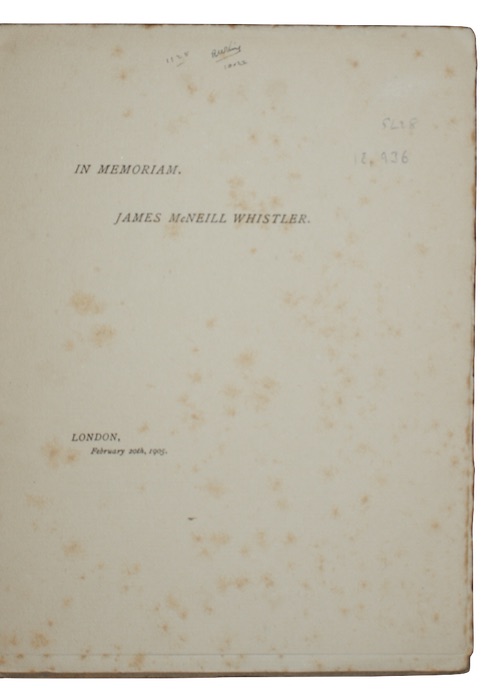The first edition of a speech delivered on 10th February 1905 at the Cafe Royal, London, by literary scholar and historian Sir Walter Alexander Raleigh (1861-1922) on the occasion of the opening of the memorial exhibition devoted to artist James McNeill Whistler (1834-1903).