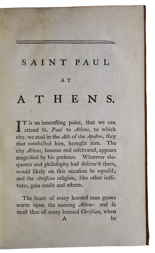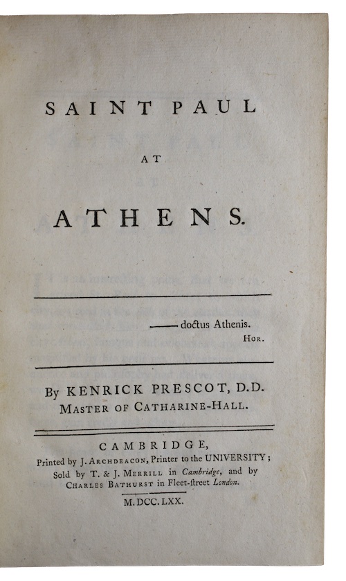 The first edition of the first published work of poet Kenrick Prescot, of whom little is known. The Monthly Review said of the work: 'In this treatise the behaviour of Saint Paul of Athens is examined, and his zeal, his eloquence, and his knowledge are mush insisted upon. The critical parts of it are not destitute of merit, but we must observe, that Dr. Prescot does not write in the most agreeable or engaging manner, and that there is nothing, perhaps, very important in his reasonings or conclusions. St. Paul, we should think, has not been very fortunate in his panegyrist'. Prescot produced four further works in successive years between 1771 and 1774; two volumes of poetry, a treatise on the writings of Horace, and an essay on Shakespeare - all of which were largely ignored.