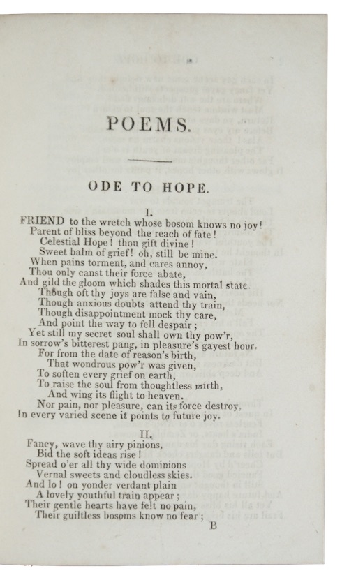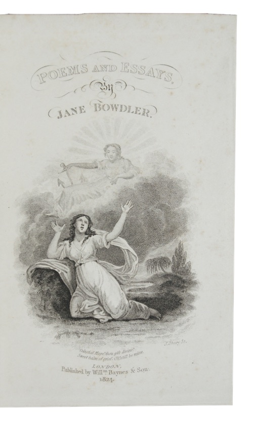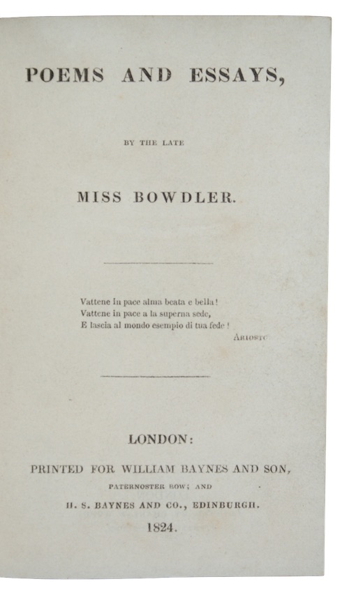 Jane Bowdler (1743-1784), poet and essayist from a literary family, with her brother Thomas and sister Henrietta Maria editing the famously expurgated Family Shakespeare (London, 1807). This, her only work, was first published posthumously in 1786 and proved immensely popular, with 14 editions appearing throughout the eighteenth-century. The collection of verse includes 'Elegy on the death of Mr. Garrick', and essays including 'On Candour' and 'On the character of Curio'. The work is said to have captured the imagination of Queen Charlotte, who apparently read it three times.