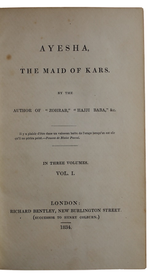 The first edition James Justinian Morier's (1782-1849) third published novel. Having pursued a career as a diplomat, primarily operating in Persia, Morier devoted his retirement to writing, first producing two travel books, A Journey through Persia, Armenia and Asia Minor (1812) and A Second Journey (1818), which both met with critical acclaim. His major work, the novel Adventures of Hajji Baba of Isphahan (1824), achieved immense popularity for its perceptive portrayal of Persian life. This was followed by three further novels based on his experiences in Persia, including the Oriental romance.