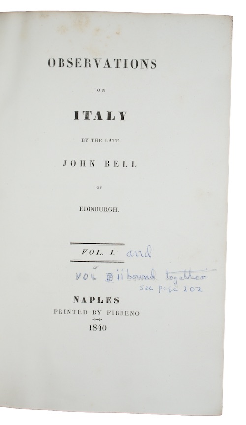 A revised and extended, Neapolitan-printed edition of Scottish surgeon and anatomist John Bell's (1763-1820) Italian tour, first printed at Edinburgh in 1825. This edition, a reissue of the second edition published by Fibreno in 1834, retains the additional chapters 'taken from the M.SS. of the Author' first included in the previous printing and the 'valuable notes' extracted from the Italian translation of the work.