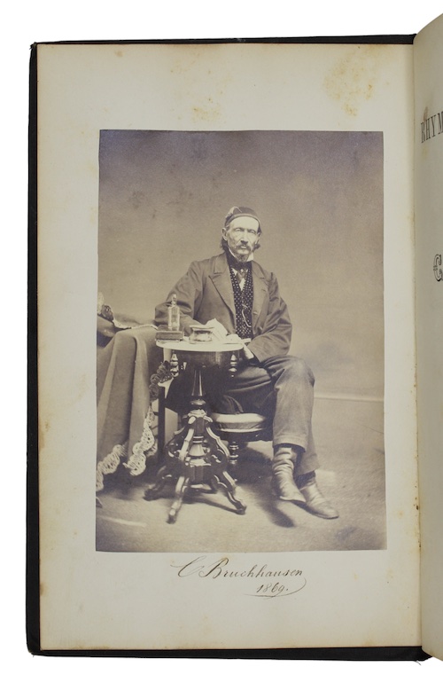 210pp, [4]. With a mounted albumen portrait frontispiece and a terminal leaf of advertisements. Original publisher's black cloth, stamped in gilt and blind, A.E.G. Extremities marked, lightly rubbed. Recent bookplate of Robert J. Hayhurst to FEP, scattered spotting. Signed by the author beneath albumen portrait: 'C. Bruchhausen / 1869'.