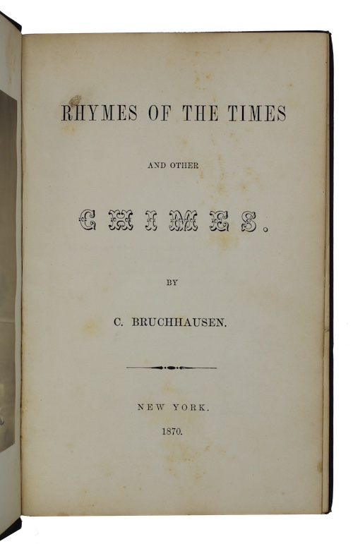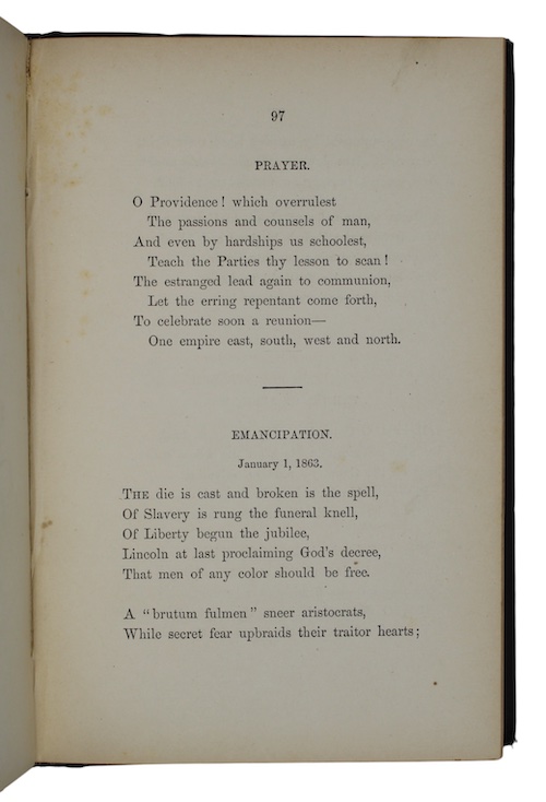 The sole edition of homeopathist physician Caspar Bruchhausen's (1806-1891) only published collection of poetry, which includes, under the heading 'Echoes of Late Events', several compositions relating to the period of reconstruction following the American Civil War, including 'Emancipation, January 1, 1863':