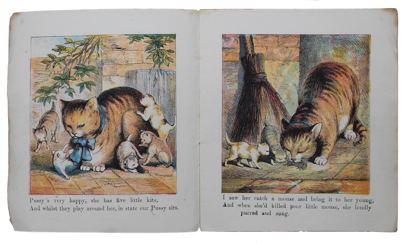 A remarkably rare survival of a charming concatenation of couplets chronicling the conduct of a child's curious cat. In colour.