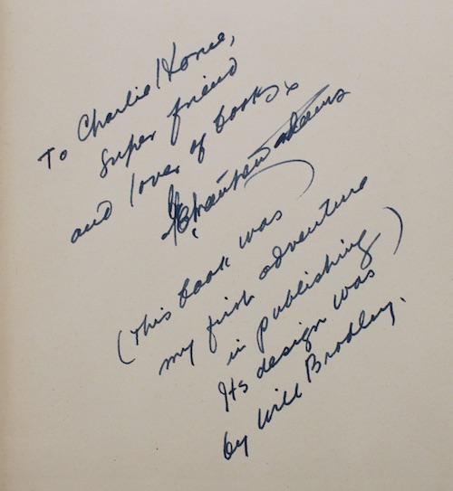 189pp, [1]. With a photographic portrait frontispiece, numerous line illustrations in the text. Uncut and unopened in original publisher's pictorial brown cloth, pictorial dustwrapper. Light shelf-wear to extremities, chipping and short tears to dustwrapper edges, upper panel detached. Internally clean and crisp. Presentation copy, inscribed by the publisher to recto of FFEP: 'To Charlie Horne / super friend / and lover of books / George Matthew Adams / (This book was / my first adventure / in publishing) / Its design was / by Will Bradley.'
