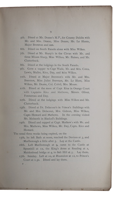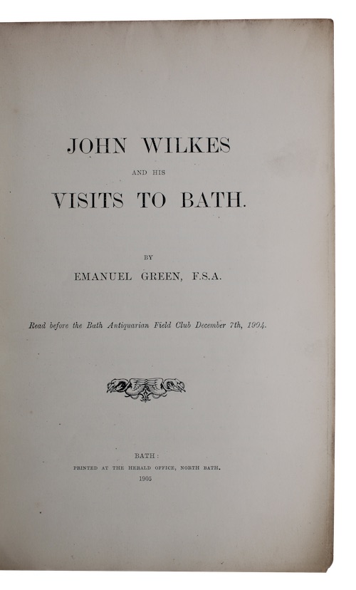 The first edition of a paper read before the Bath Antiquarian Field Club on 7th December 1904, documenting the visits to Bath made by M.P. for Aylesbury and sometime Mayor of London, John Wilkes (1727-1797).