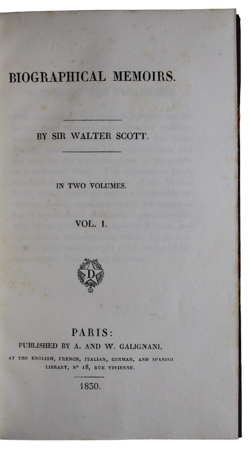 A series of succinct memoirs by Sir Walter Scott (1771-1832) 'selected from various miscellaneous publications...now for the first time given to the public in a collected form'. The illustrious subjects of these portraits include, inter alia, Anna Seward, George III, Daniel Defoe, and Lord Byron.