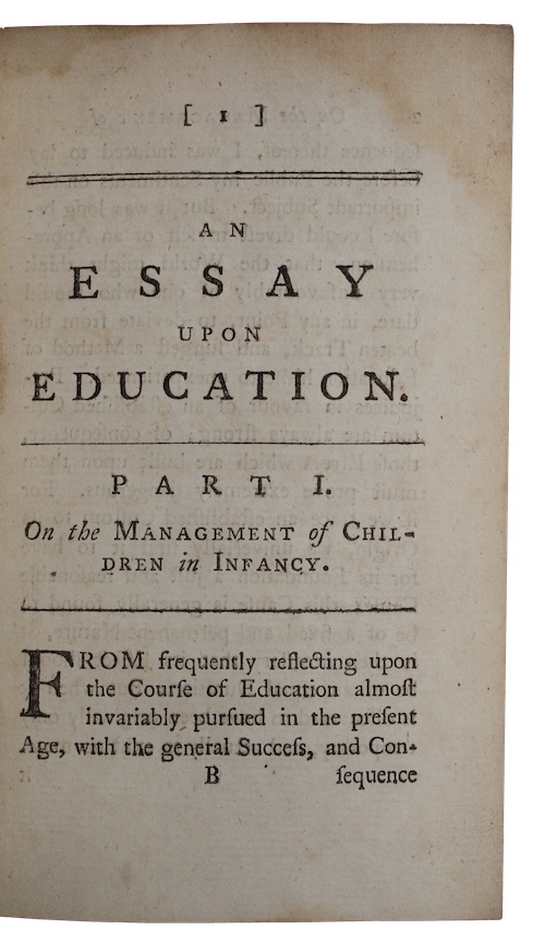 The sole edition of a discourse on education; the only published work of Anglican clergyman James Wadham Whitchurch (1749/50-1776), of whom little is known. Presented in three parts, the work takes as its inspiration the writings of Rousseau, the final part is entirely devoted to the 'advantages and disadvantages of travelling into foreign countries'.