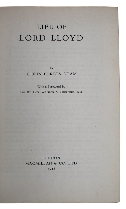 The first edition of a biography of politician and colonial administrator George Ambrose Lloyd, first Baron Lloyd (1879-1941), notable for his his service in North Africa during the First World War where he befriended T. E. Lawrence. The foreword was provided by Winston Churchill.