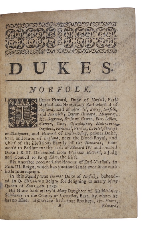 A rare survival of the first edition (the work was purportedly republished in the same year with the addition of plates, though no copies appear extant) of a series of succinct histories of notable members of the British aristocracy, with a preface 'concerning the Antiquity and Usefulness of Heraldry, and the Office of our English Heralds'.