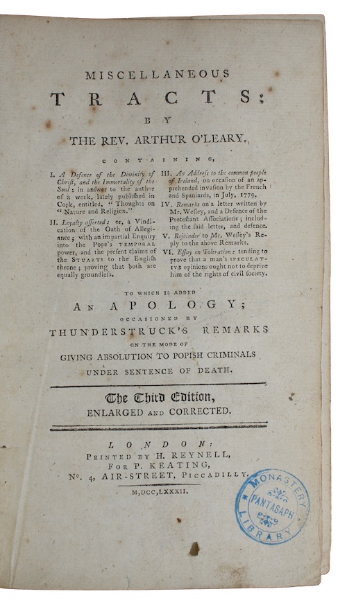 A revised and enlarged edition of the collected devotional works of Roman Catholic priest and religious controversialist Arthur O'Leary (1729-1802), including his incendiary Essay on Toleration (1780), one of the most radical statements in favour of religious and political forbearance published in late eighteenth-century Ireland. Initially printed in Dublin in 1781, this first London edition contains an additional chapter entitled 'Thunderstruck's remarks on the nature of giving absolution to popish criminals under sentence of death'.