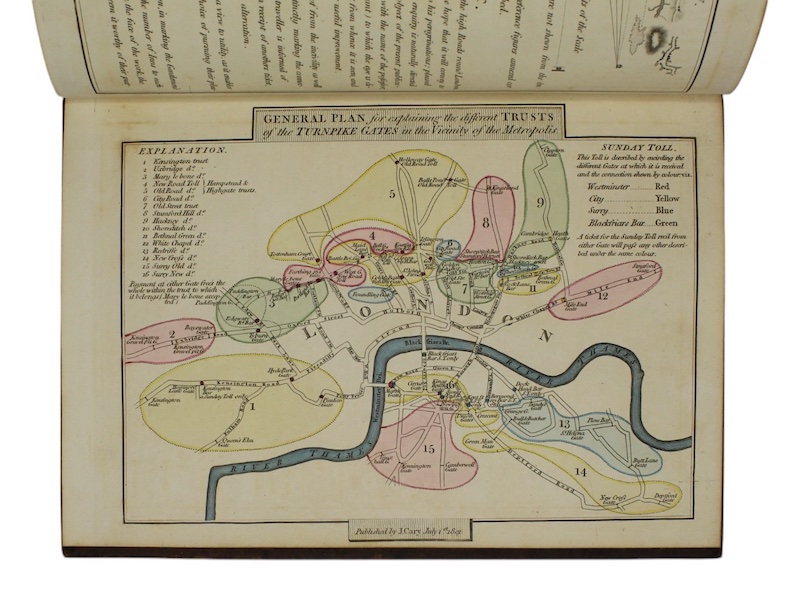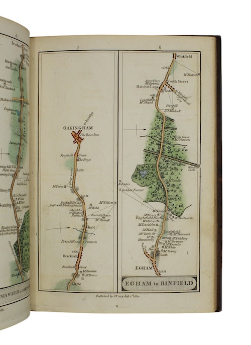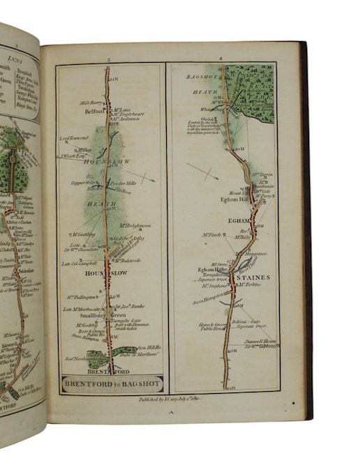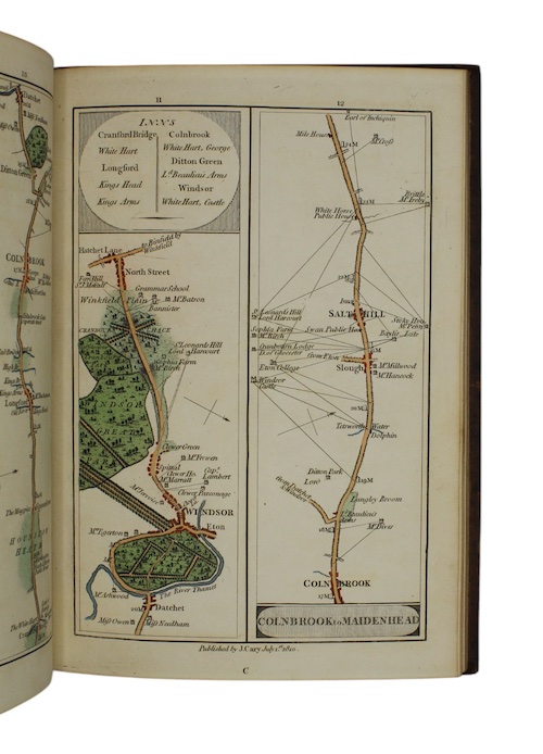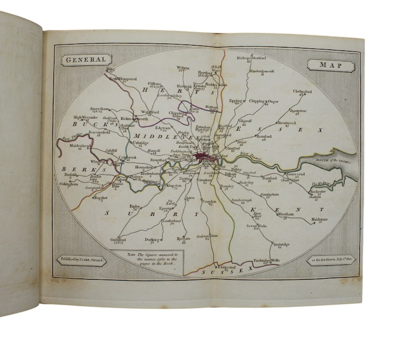The final edition of cartographer John Cary's (1755-1835) atlas, executed to his typically high standards, showing the major routes out of London to destinations including Hampton Court, Windsor, Maidenhead, High Wycombe, St. Albans, Welwyn, Hertford, Chelmsford, Maidstone, and Tunbridge Wells. In addition, the maps depict 'every Gentleman's seat, situate on, or seen from the Road...with the Name of the Possessor; to which is added the Number of Inns on each separate Route; also, the different Turnpike Gates, shewing the Connection which one trust has with another'. The English Review (Vol. XVII, 1791, p.386) said of the work: 'We consider it as an entertaining and useful companion to the numerous travellers who are constantly issuing from every quarter of this immense metropolis'.