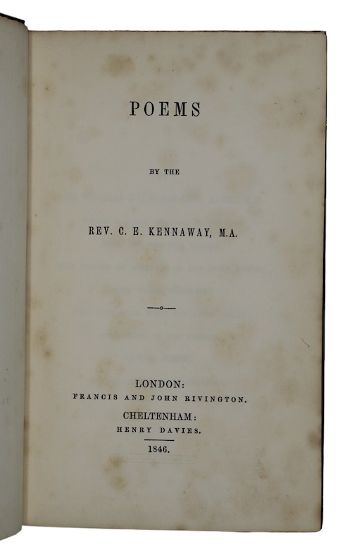 The first edition of Church of England clergyman Charles Edward Kennaway's (1800-1875) only published collection of verse, predominantly devotional in nature, though containing a sequence of sonnets on a martial theme; 'Waterloo', 'Waterloo - War', Waterloo - To the Duke of Wellington', and Waterloo - The Battle Field'.