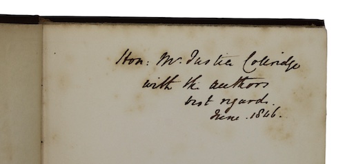 This copy inscribed to John Taylor Coleridge (1790-1876), judge, sometime editor of the Quarterly Review, nephew of the Romantic poet, Samuel Taylor Coleridge.