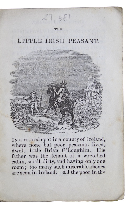 A rare survival, in original bright and crisp state, of the eighty-seventh title in the Religious Tract Society's series of eight-page chapbooks for children. The narrative concerns young Brian O'Loughlin, the titular Irish peasant, 'very ignorant in book learning and in the knowledge of holy things', who is liberated from destitution by the kindness of an English gentleman who provides him with a first-class education and lodgings in his stately home.