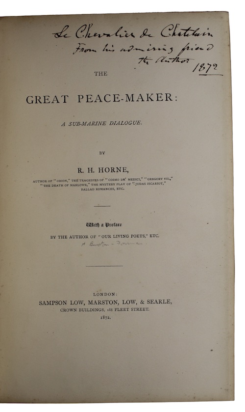 The first trade edition (preceded by an edition printed by Robson and Son for private distribution and issued the year prior) of Richard Hengist Horne's (1802-1884) curious poem that takes the form of a dialogue held between a 'telegraph cable' and 'the sea'. In the preface by Henry Buxton Forman (1842-1917) we learn that a portion of the poem appeared in Household Words (edited by Horne's close friend Charles Dickens) and was written to commemorate the laying of the first successful submarine cable between Dover and Calais in 1851.