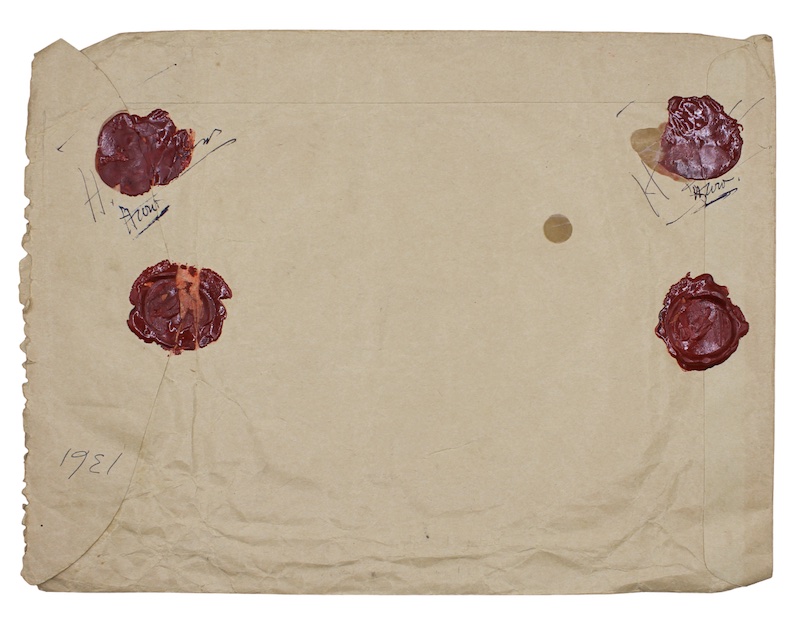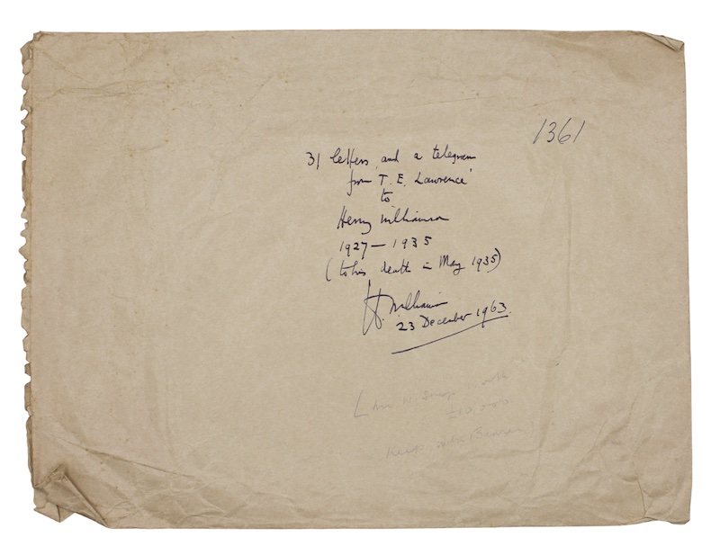 Noted in Williamson's hand to the front of the envelope is '31 letters and a telegram from 'T. E. Lawrence' to Henry Williamson 1927-1935 (to his death in May 1935). H. Williamson 23 December 1963.' As well as his letters, the envelope once contained Lawrence's final telegram. The telegram, dated May 13th 1935, was addressed to Williamson in response to his most recent letter, confirming 'Lunch Tuesday wet fine, cottage 1 mile North Bovington Camp. Shaw.'. Lawrence was thrown from his motorcycle on his return from the post office; never to regain consciousness. The telegram was sold by Sotheby's in 2014 for £7,200.