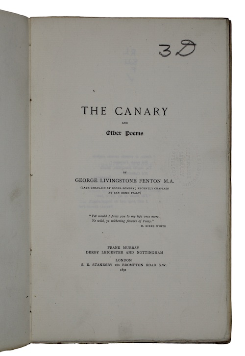 FENTON, George Livingstone. The canary and Other Poems.