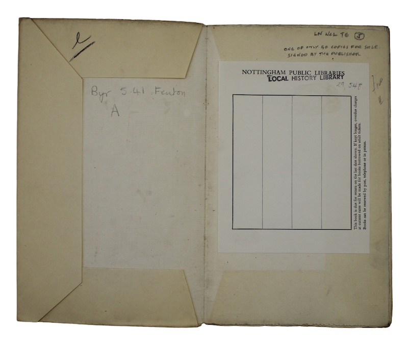 8vo. Large paper edition of 60 copies (50 of which for sale), this being number 29, signed by the publisher. x, [2], 65pp, [3]. With a half-title and a terminal leaf of publisher's advertisements. Unopened in original publisher's printed buff paper wrappers. Extremities, lightly rubbed, marked, and discoloured. Nottingham Public Libraries loan card pasted to recto of FFEP, blind-stamp of same to title page.