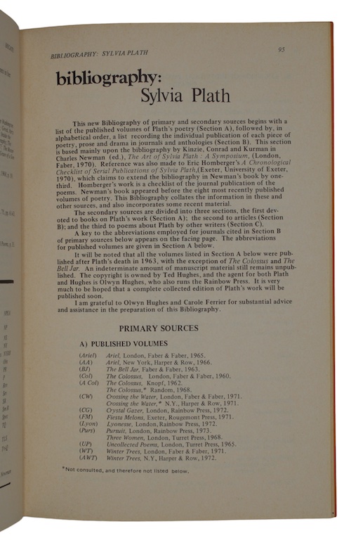 Hecate is an Australian feminist academic journal founded in 1975. This edition (Vol. 1, no. 2) includes a bibliography of Sylvia Plath compiled by Stuart Cunningham, with thanks given to Olwyn Hughes and Carole Ferrier.