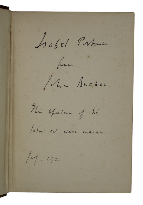 vii, [1] 11-290pp. Original publisher's yellow cloth boards lettered red. Inscribed by Buchan on the FFEP 'Isabel Portman from John Buchan. This specimen of his later and worse manner', dated 1921. Boards a little rubbed and marked, spine slightly sunned. Internally bright and clean save light foxing to pastedowns. Loosely inserted in an invoice for both this and several other Buchan titles from Charles Rare Books, Buntingford, dated 1959.