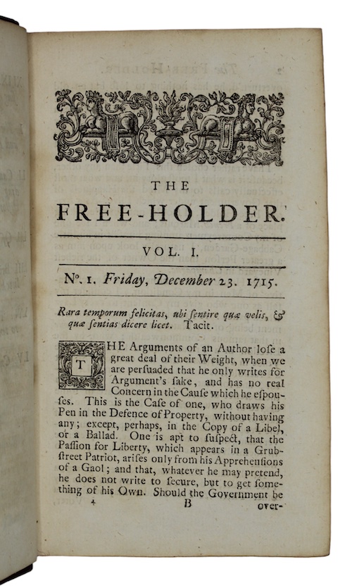 The first collected edition of essayist Joseph Addison's (1672-1719) fifty-five political papers, initially published between 23rd December 1715 and 29th June 1716, including 'Of His Majesty's Character', 'Of Party-Lies', and 'The Female Association'.