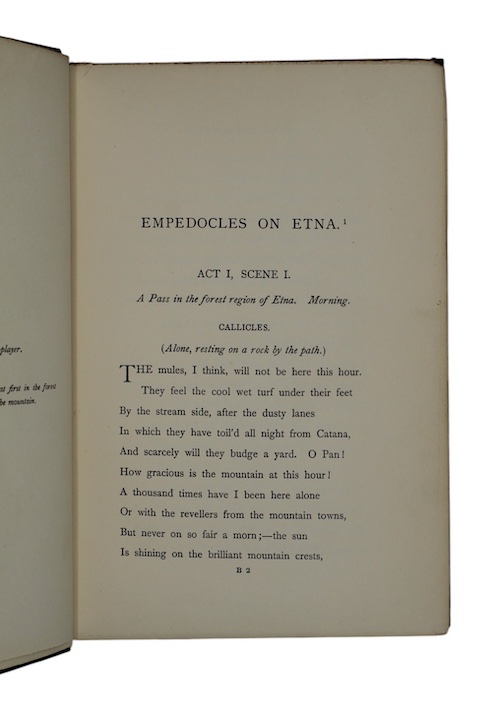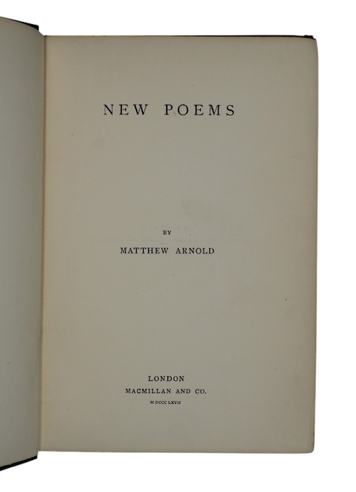 The first edition of Matthew Arnold's (1822-1888) New Poems, within which all but seven poems are printed for the first time. Among these is the famous 'Dover Beach', sometimes cited as the first occurrence of modernist sensibility in verse, which was later referenced in a swathe of subsequent literature and popular culture, including Bradbury's Farenheit 451 (1953), Heller's Catch-22 (1961), Dodie Smith's I Capture the Castle (1940), and even the musical Cabaret (1966). This collection also includes several reprints from Arnold's Empedocles on Etna, and Other Poems (1852) - despite an initial lacklustre reception, Arnold was compelled to also reissue Empedocles in 1867 after encouragement from fellow poet Robert Browning.
