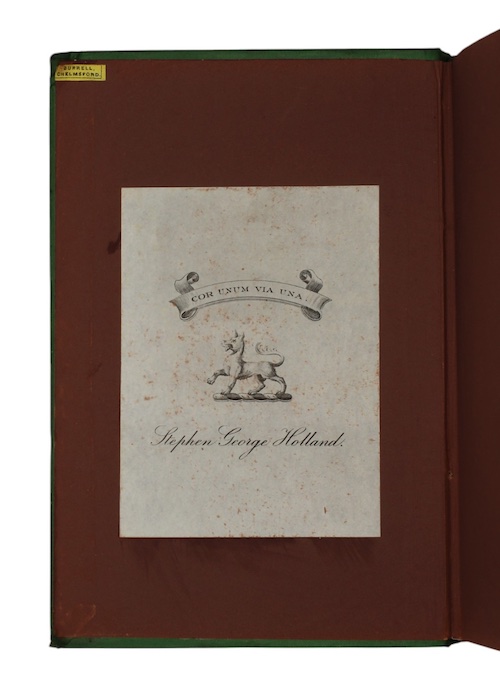 viii, 244pp. With a half-title. Bound by Burn of London in original publisher's gilt-stamped green cloth. A trifle rubbed, spine slightly dulled. Armorial bookplate of Stephen George Holland and later ticket of Burrell of Chelmsford to FEP, early inked ownership inscription to recto of FFEP.