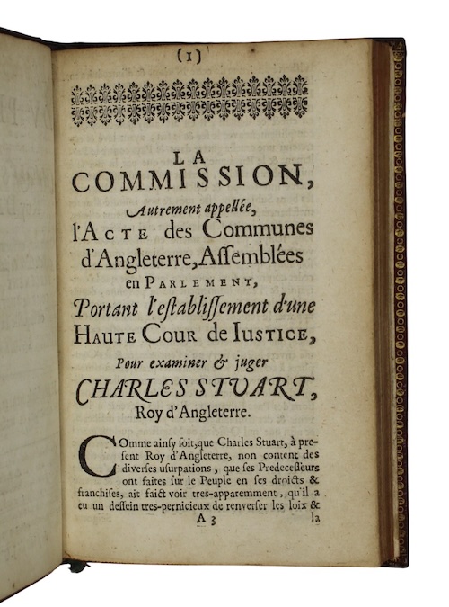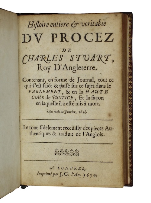 A choice copy in red morocco of one of three separate issues, all appearing in 1650 but only one of which set, as here, in duodecimo, of this scarce French account of the trial and execution of King Charles I printed in London by royalist John Grismond (fl.1639-1666).