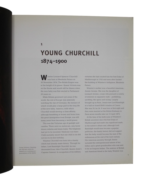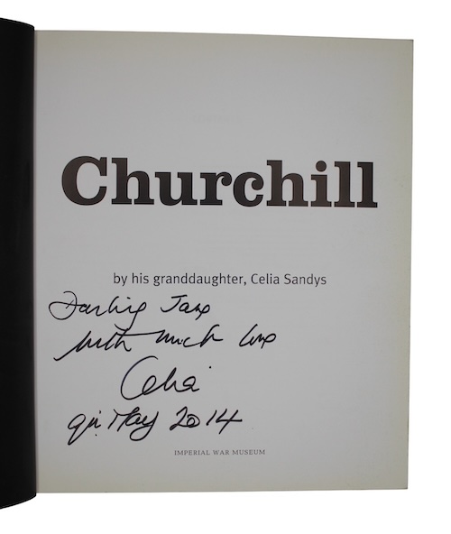 A presentation copy of a well-illustrated biographical account, organised chronologically and intended to serve as a companion to the permanent exhibition at the Churchill War Rooms, of Winston Churchill by his youngest granddaughter Celia Sandys (b.1943). Her touching foreword notes that she hopes 'that this book will prove to be a worthy reminder of the inspiring story of the extraordinary man whom I am proud to have called Grandpapa'.