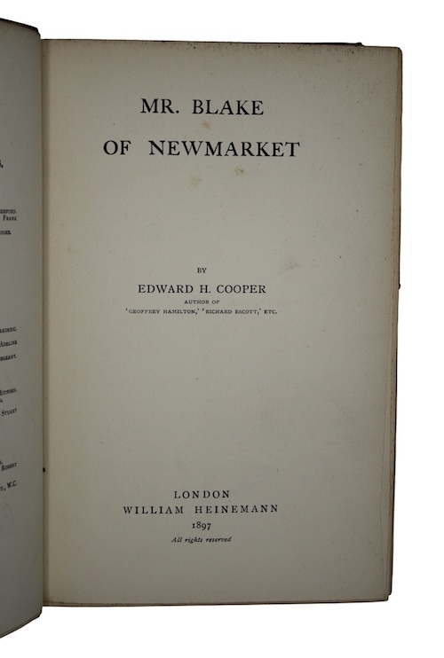 The first edition of the most successful novel by Edward Herbert Cooper (1867–1910), journalist, novelist and Suffolk liberal unionist. Set in his hometown of Newmarket, the sporting novel received a new edition in 1904. Cooper, who was particularly passionate about the welfare of children, also penned a respected series of juvenile stories, beginning with Wyemark and the Sea Fairies in 1899.